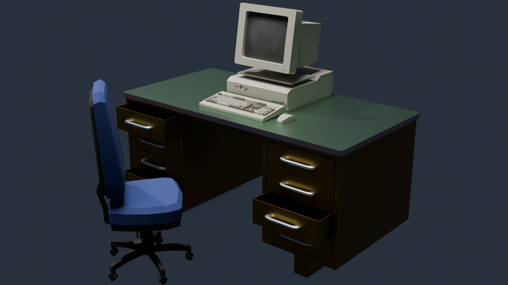 Retro Office Pack – Low-Poly Stylized (PC + Desk + Chair)